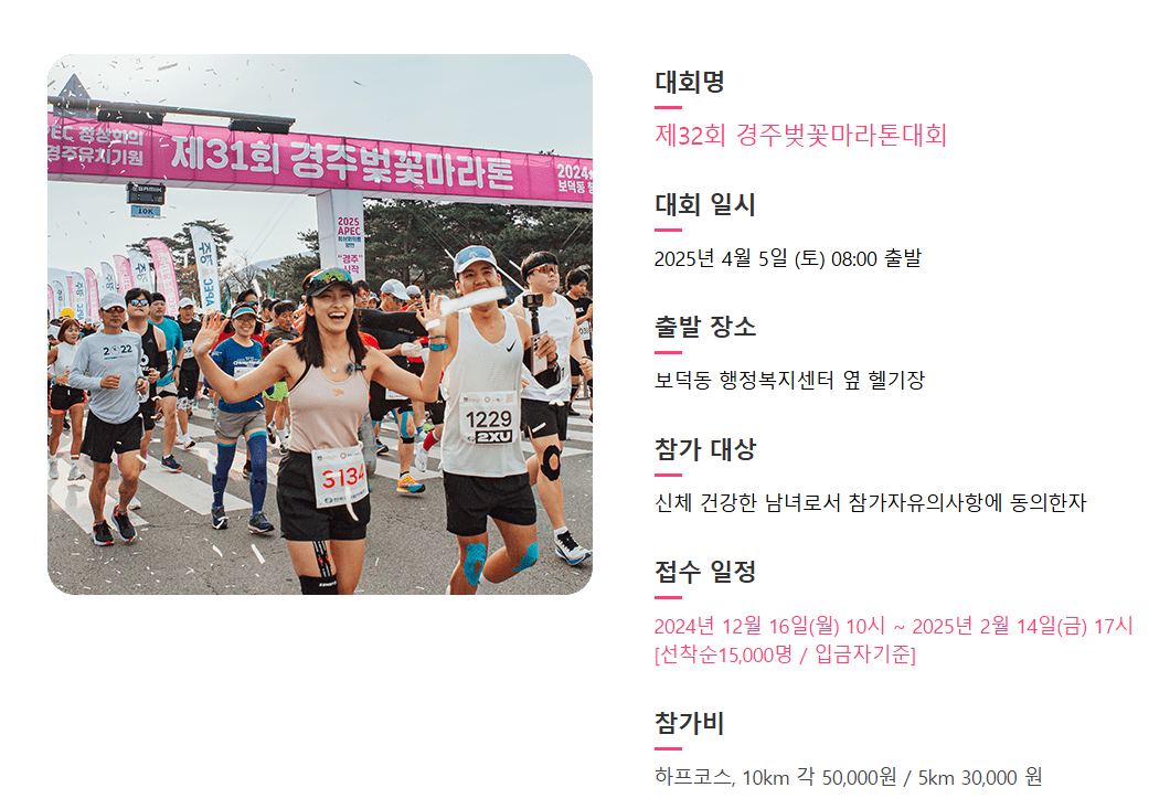 참가 신청은 2024년 12월 16일(월) 오전 10시부터 2025년 2월 14일(금) 오후 5시까지 진행되며, 선착순 15,000명을 모집합니다. 참가를 원하시는 분들은 경주벚꽃마라톤 공식 홈페이지를 통해 신청하실 수 있습니다.