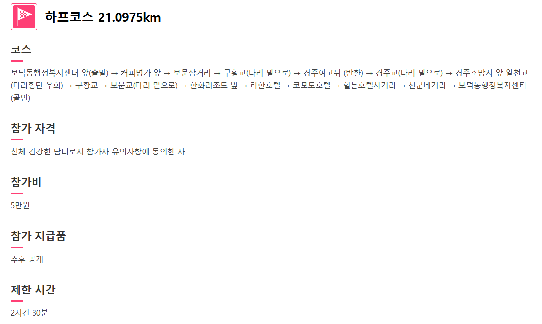 이번 대회는 교통 혼잡을 최소화하기 위해 기존의 풀코스 부문을 폐지하고, 하프코스(21.0975km), 10km, 5km 부문만 운영합니다. 참가비는 하프코스와 10km 부문은 각 50,000원, 5km 부문은 30,000원입니다.