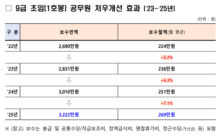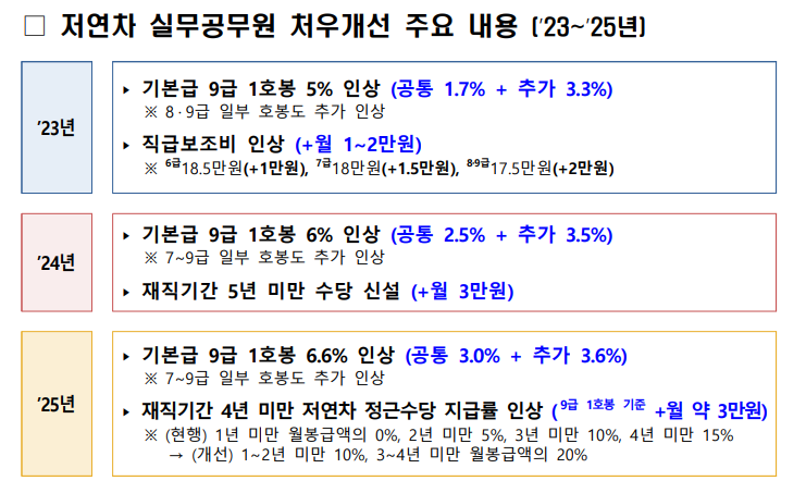 인사혁신처 2024.12.31 - 2025년 공무원 보수 3.0% 인상…저연차 실무 공무원 추가 처우개선 -? ?2025년 전체 공무원 보수가 전년 대비 3.0% 인상된다.??아울러 저연차 실무 공무원의 처우를 추가로