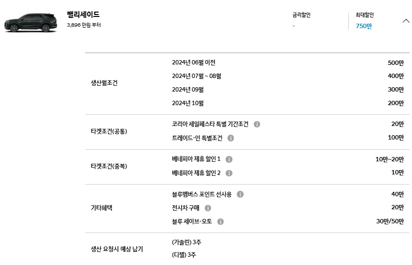 대형 SUV인 팰리세이드는 최대 500만 원의 할인 혜택을 제공합니다. 팰리세이드는 넓은 실내 공간과 고급스러운 내외관 디자인으로 꾸준한 인기를 끌고 있으며, 이번 행사를 통해 많은 고객이 팰리세이드의 매력을 경험할 기회를 가질 것으로 예상됩니다.