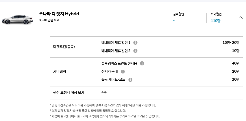 현대자동차의 인기 차종인 쏘나타, 그랜저, 싼타페에 대해 최대 200만 원 할인이 적용됩니다. 하이브리드 모델도 포함되어 있어, 고연비를 자랑하는 차량을 합리적인 가격에 구매할 수 있습니다.
