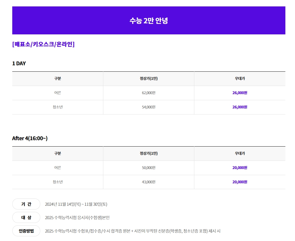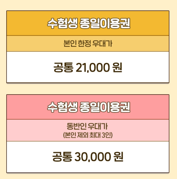 에버랜드: 11월 14일부터 12월 31일까지 수험생 본인 및 동반 3인까지 할인된 가격으로 입장이 가능합니다. 수험생 본인은 종일 이용권을 2만 1,000원에, 동반인은 3만 원에 이용할 수 있습니다.