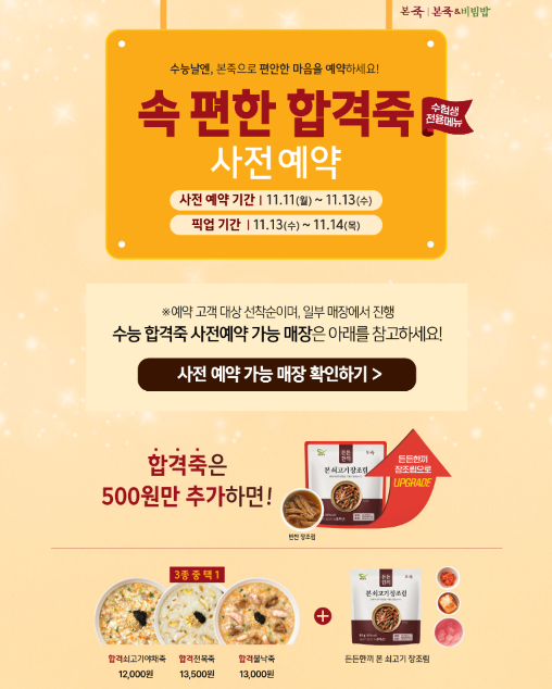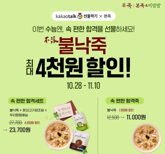 본죽: 카카오 선물하기를 통해 불낙죽과 합격 세트를 할인된 가격에 제공합니다.
