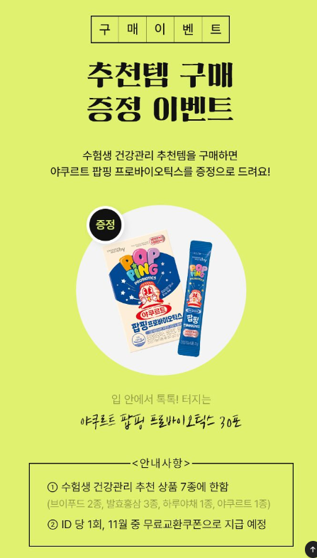 HY(한국야쿠르트): 고함량 멀티비타민미네랄 제품 등을 최대 28% 할인하며, 특정 제품 구매 시 추가 증정 이벤트도 진행합니다. 이는 수험생이 피로 회복과 면역력 향상에 도움을 받을 수 있는 기회를 제공합니다.