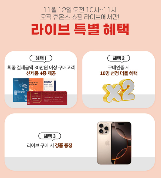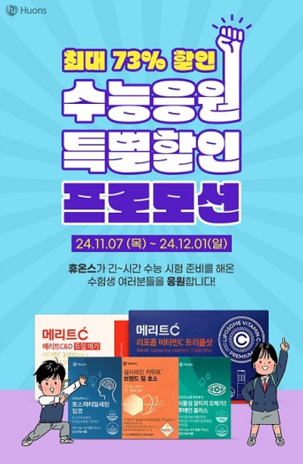 휴온스: 식물성 알티지 오메가3 루테인 플러스, 포스파티딜세린 징코, 살사라진 카무트 효소 등을 최대 73% 할인된 가격으로 제공하여, 수험생들이 정신 건강과 피로 회복에 도움을 받을 수 있습니다.