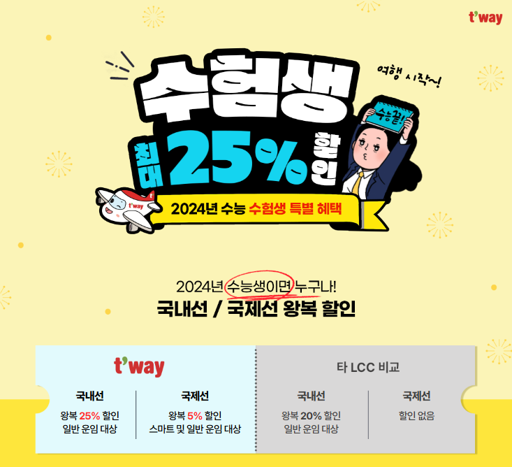 티웨이항공: 2025 수능을 치른 수험생 본인에게 국내선 최대 25%, 국제선 최대 10% 할인 혜택을 제공합니다. 할인 대상은 내년 2월까지 적용되며, 한국 국적의 대학 진학 예정 학생들에게 혜택이 제공됩니다.