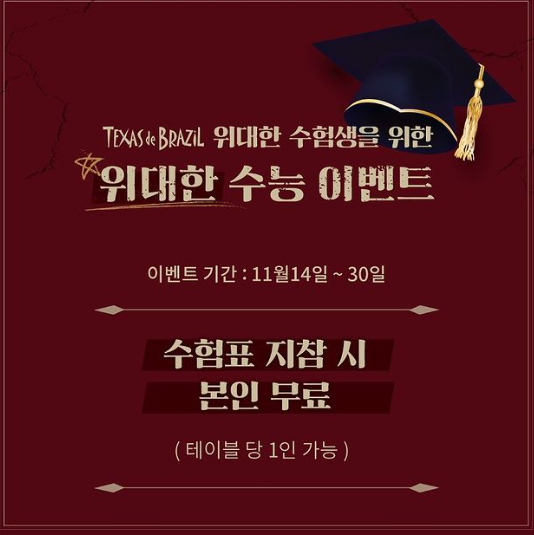 고생한 대입 수험생을 위해~~~ 카카오톡 채널 친구에게만 제공하는 텍사스데브라질의 선물이 올해도 찾아왔습니다. 2024년 수능 수험표를 지참하고 오시면, 무제한 슈하스코가 무료로 제공됩니