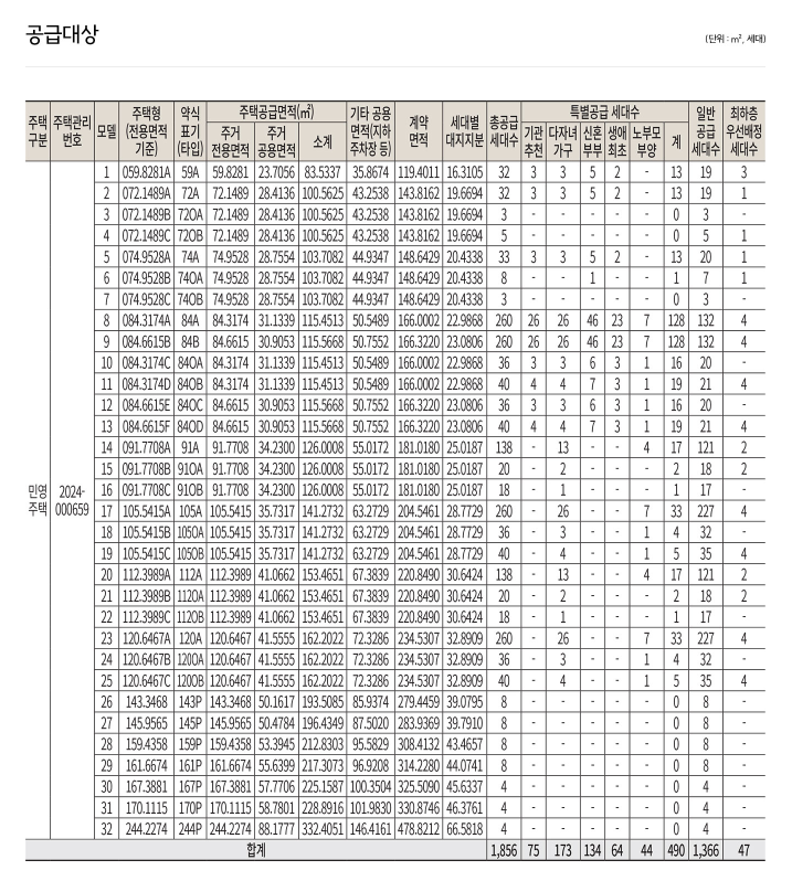 ● 생애 최초 공급: 총 4565명의 신청자가 몰리며 특별공급 중 가장 높은 관심을 받았습니다. 특히, 전용면적 59㎡A 타입은 2가구 모집에 무려 3588명이 신청해 1794대 1의 경쟁률을 기록했습니다.