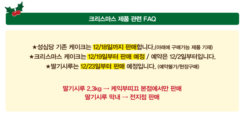 현장판매: 딸기시루 케이크는 예약 불가, 12월 23일부터 25일까지 현장 판매.