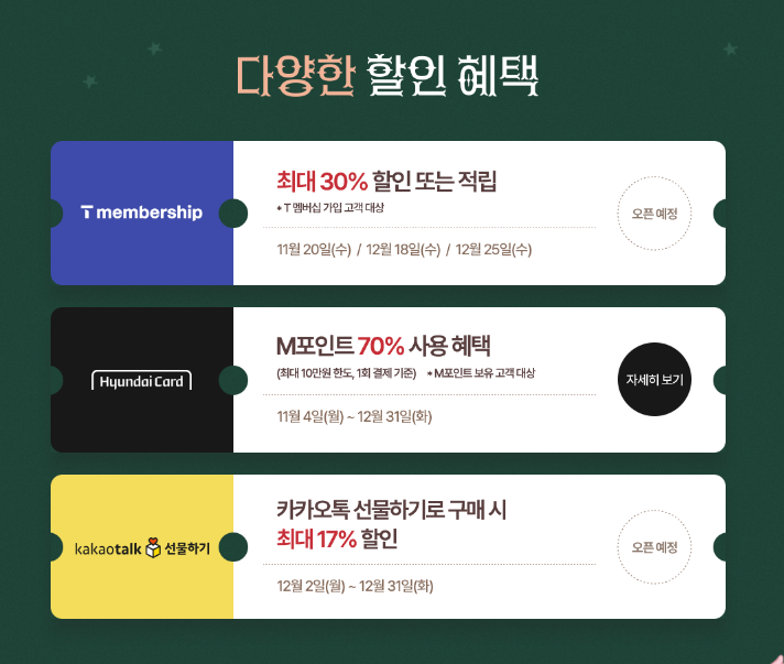 ● 다양한 결제 프로모션: 카드사별 할인 및 적립 혜택 제공.