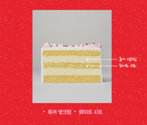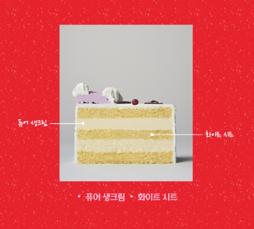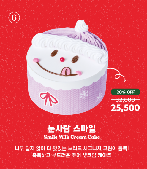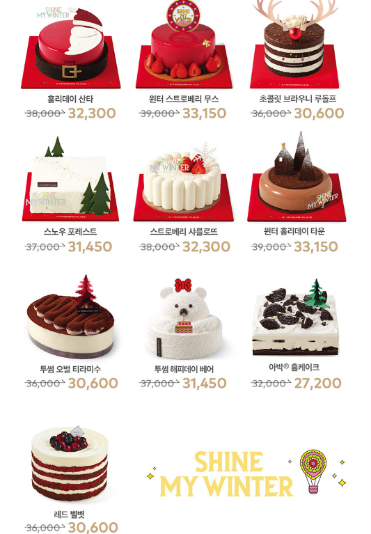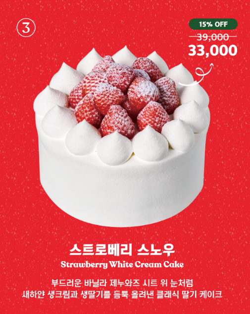 ● 윈터스트로베리무스 (39,000원): 딸기 무스와 부드러운 크림 층이 조화를 이루는 제품. 겨울의 화이트 크리스마스를 연상케 합니다.