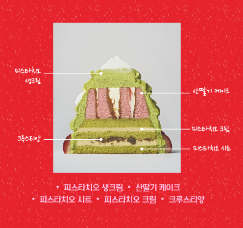 ● 홀리데이 레드초코 (35,000원): 진한 초콜릿 시트와 붉은 베리 토핑으로 크리스마스 분위기를 표현.