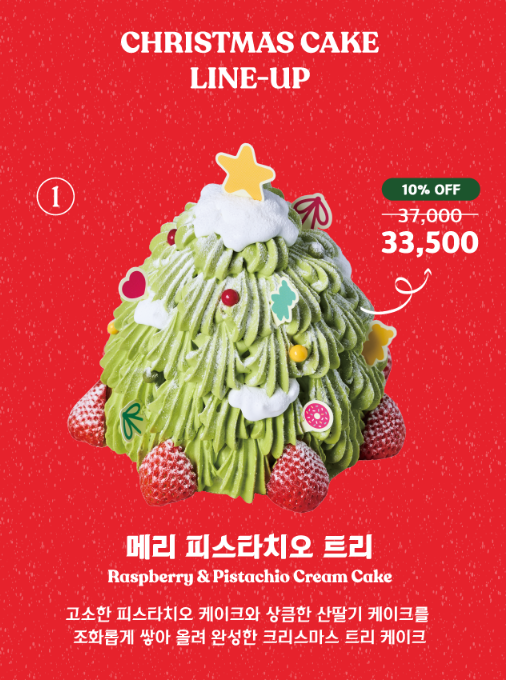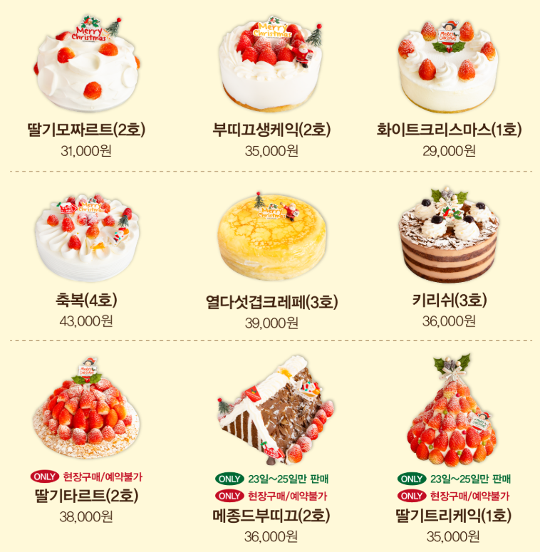 ● 위싱트리 케이크 (36,000원): 흰색 크림과 트리 모양 장식으로 크리스마스의 클래식한 분위기를 담았습니다. ● 스트로베리초코생크림 (38,000원): 부드러운 초코 생크림과 딸기의 상큼함이 어우러진 케이크.