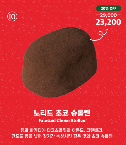 ●슈톨렌 2종 (11월 11일 출시): 노티드 슈톨렌: 럼과 건과일이 조화를 이룬 독일 전통 디저트.