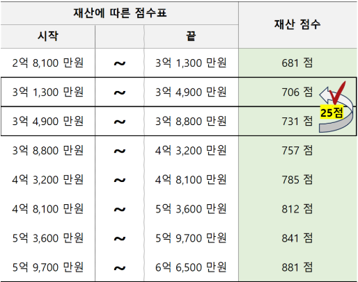 ● 변경된 방식: 재산 점수 기준을 완화하고, 특정 금액 이하의 재산 보유자는 점수 부여 대상에서 제외.