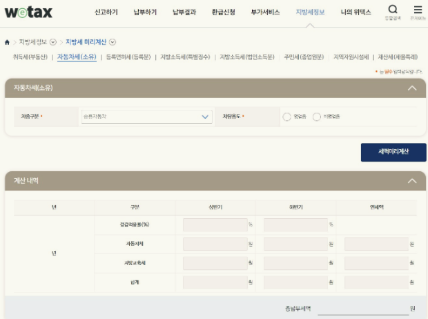 조회 방법:위택스 홈페이지 접속->회원 가입 및 로그인->'납부하기' → '자동차세' 선택->본인 소유 차량의 세금 확인